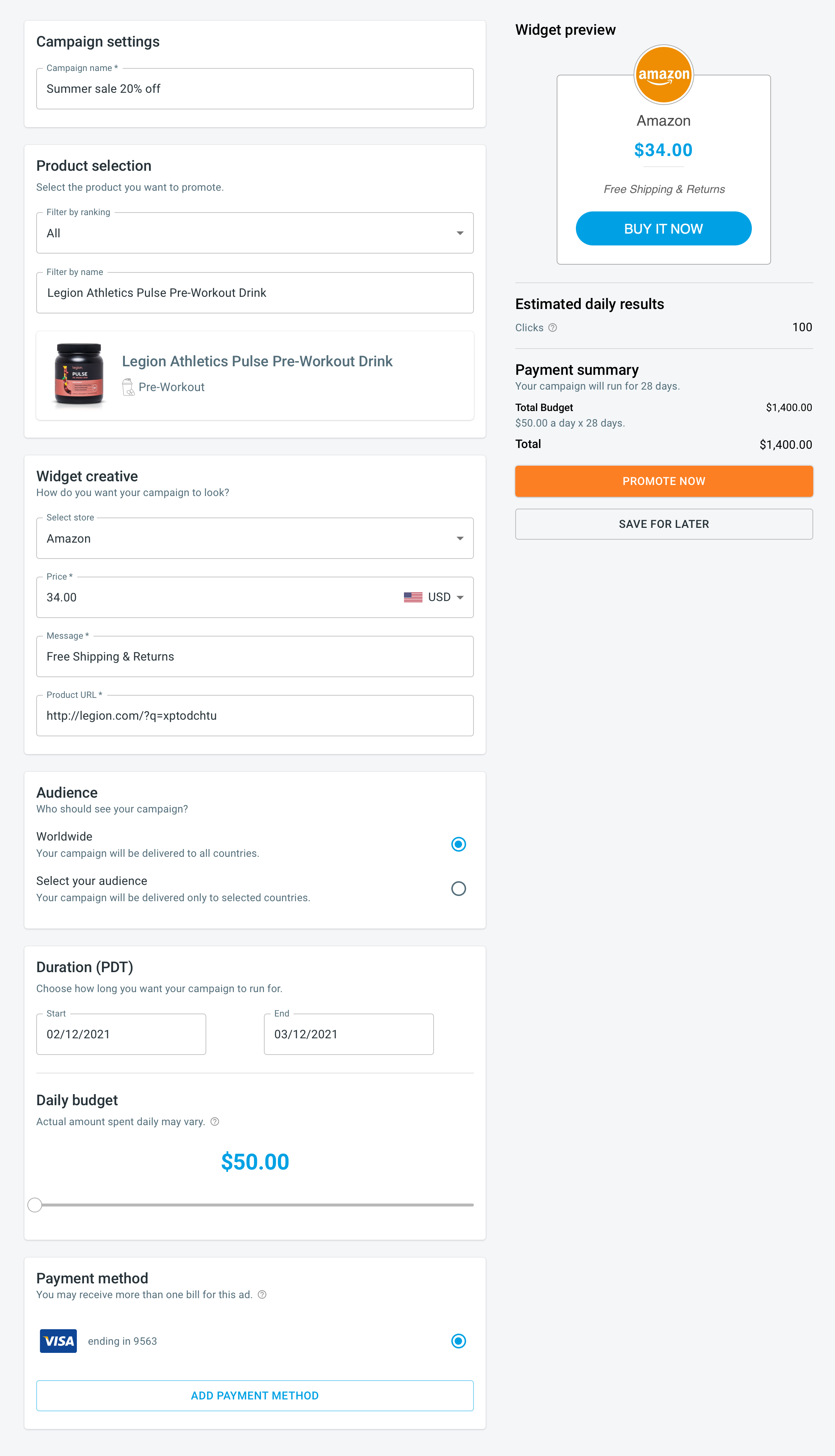 Choose how long you want the campaign to run. Have full control over your budget with a preselected daily budget for each campaign. Manage your payment sources as you go.